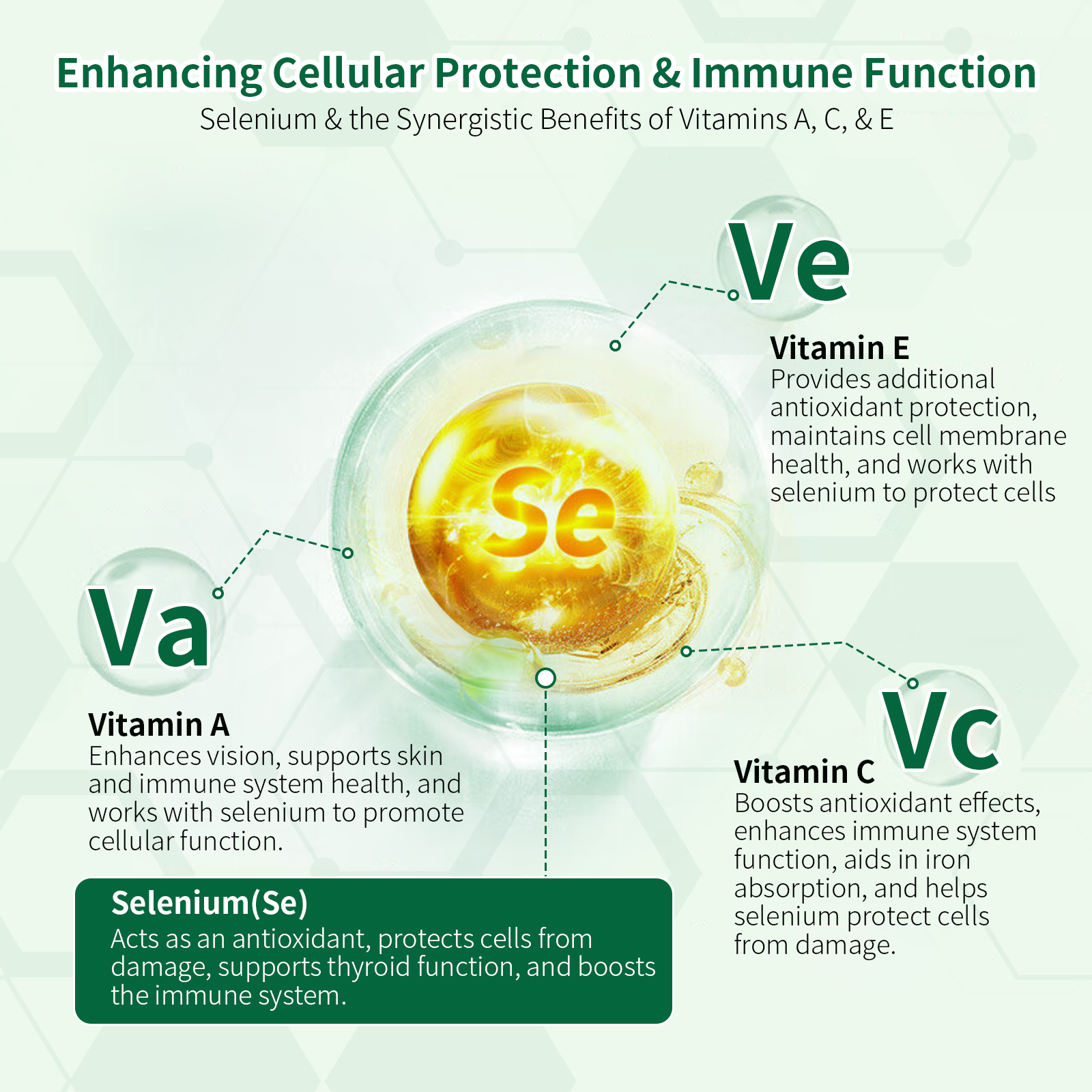 **Vitamin A**: Enhances vision, supports skin and immune system health, and works with selenium to promote cellular function.