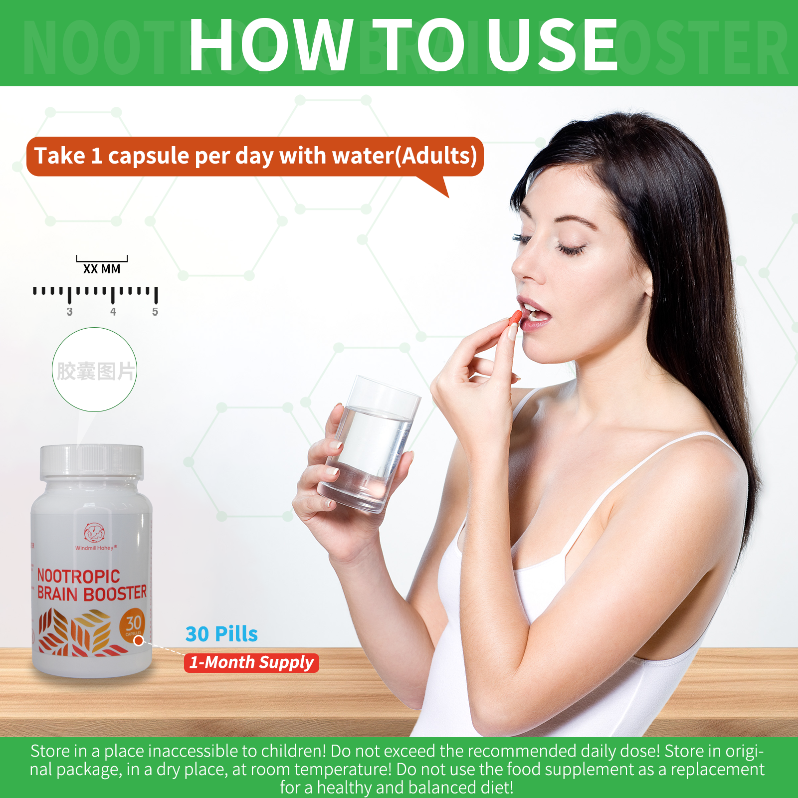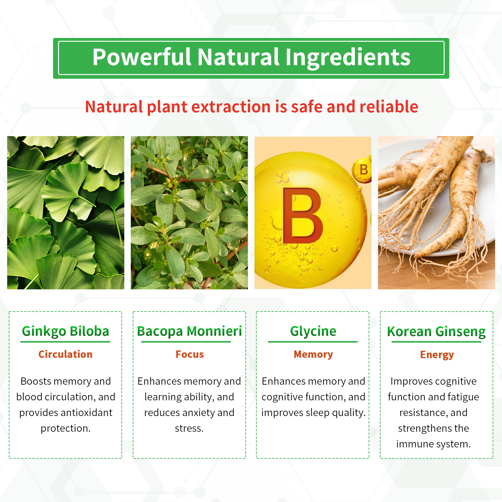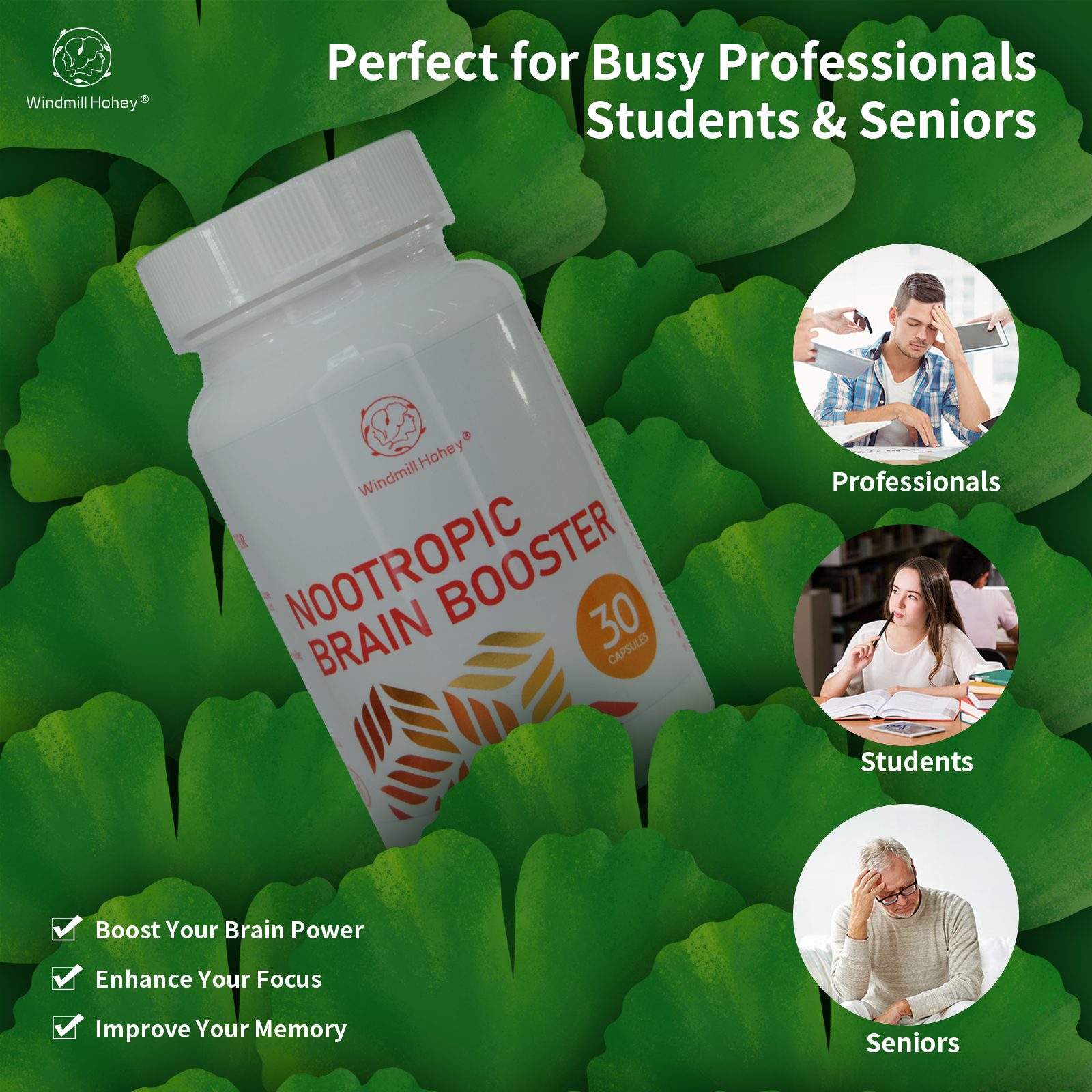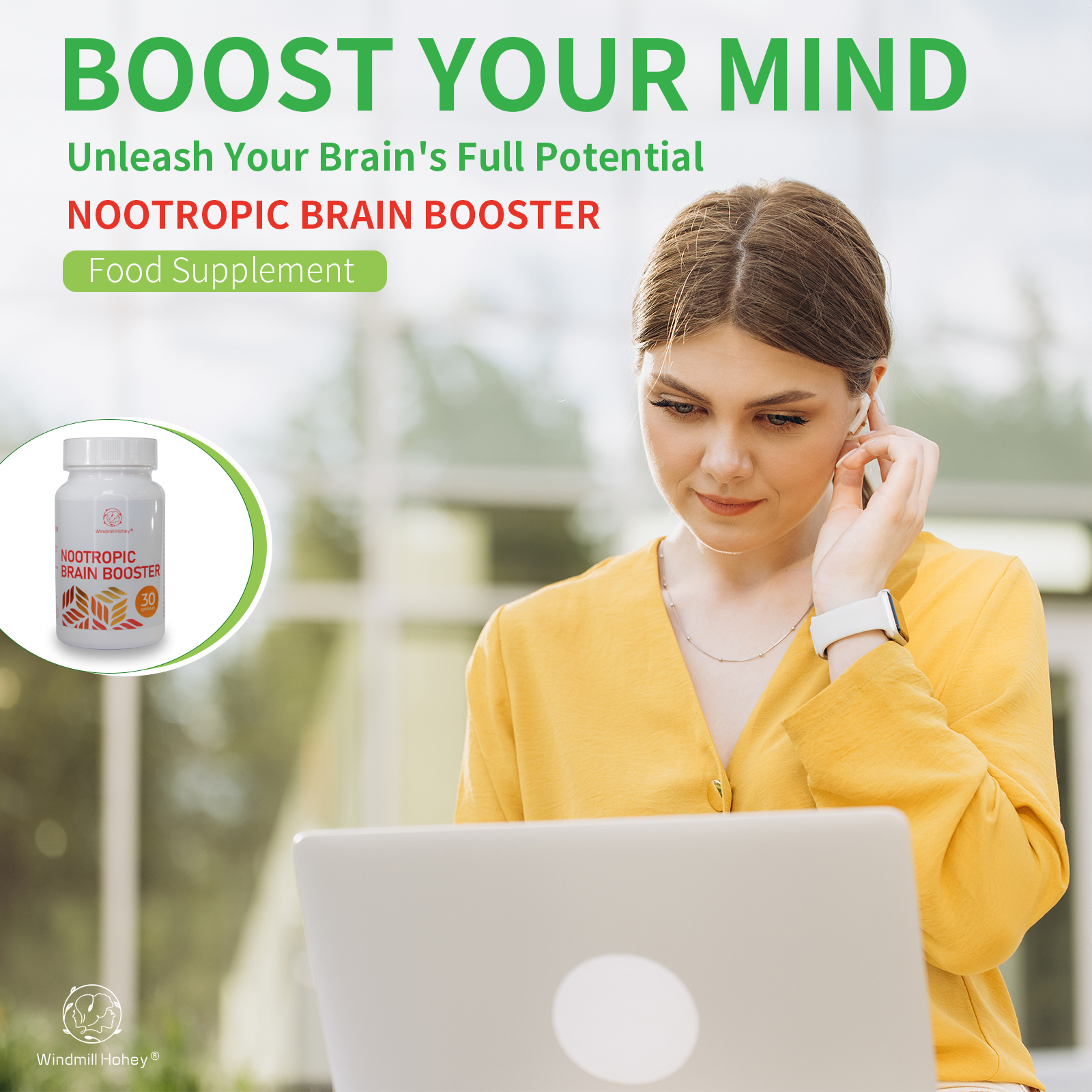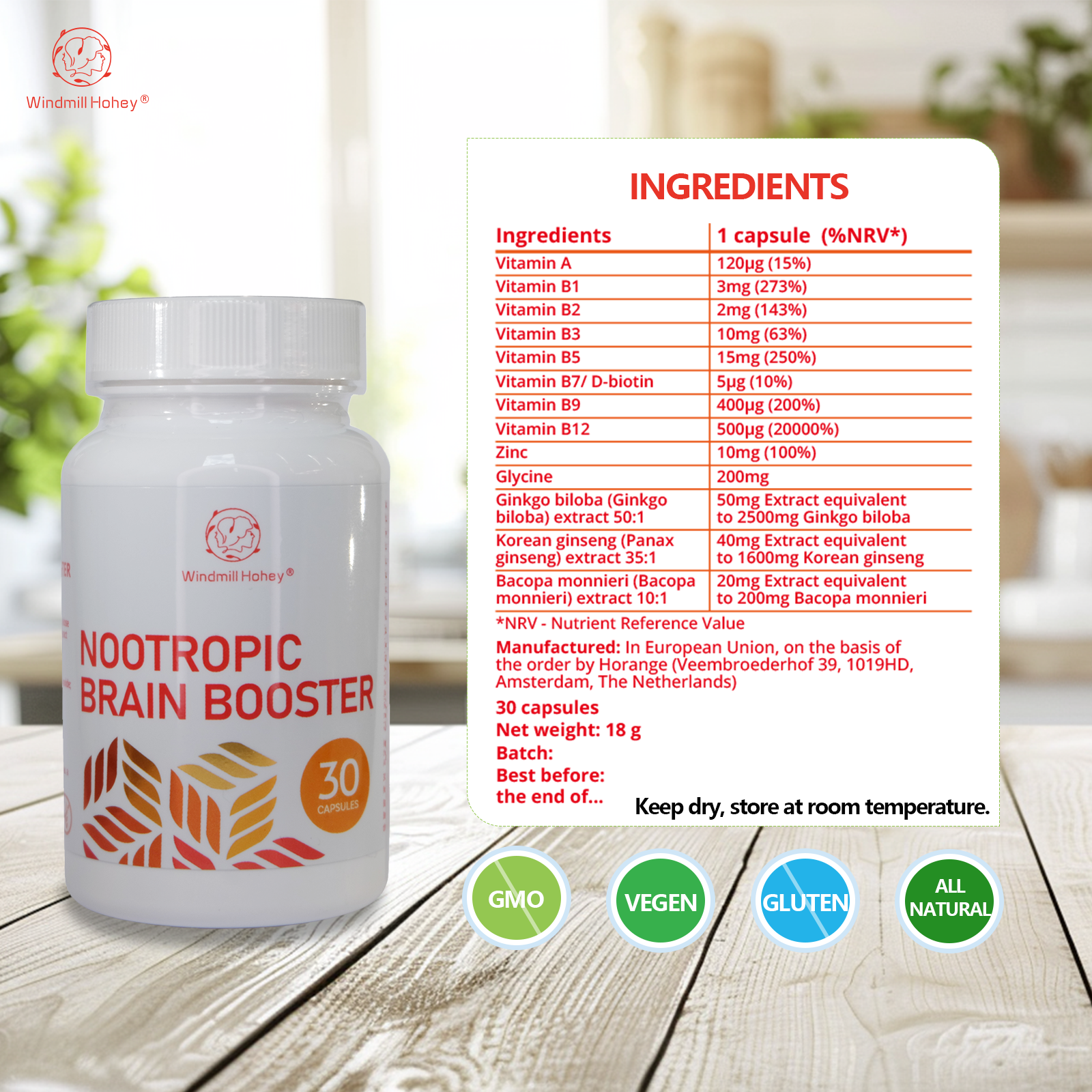 Improve your mental performance with our Nootropic Brain Booster capsules! They contain high-quality natural ingredients such as glycine, ginkgo biloba, Korean ginseng and bacopa monnieri extract, support brain function, promote memory performance and increase mental performance, perfect for people who want to improve their concentration.