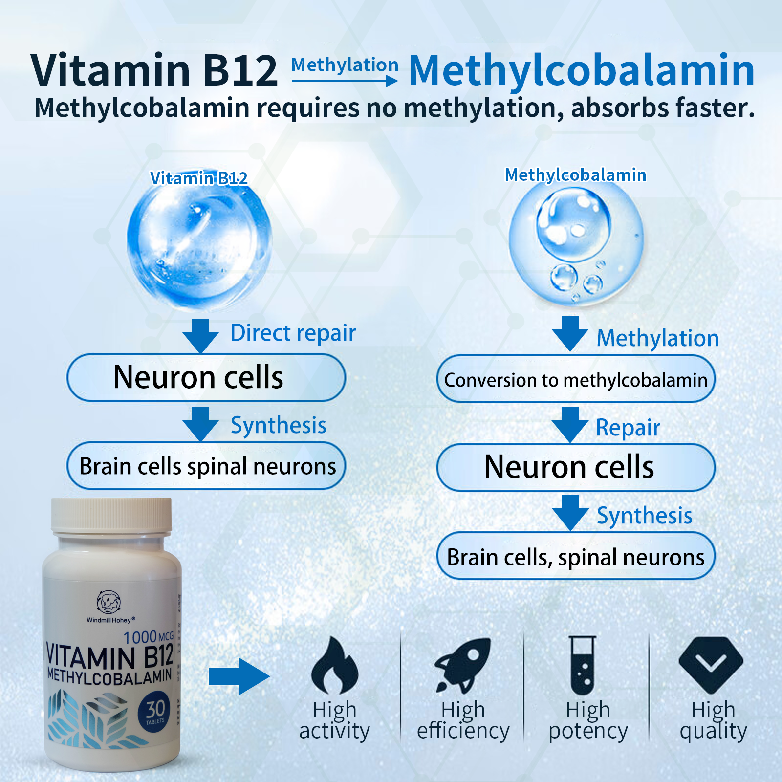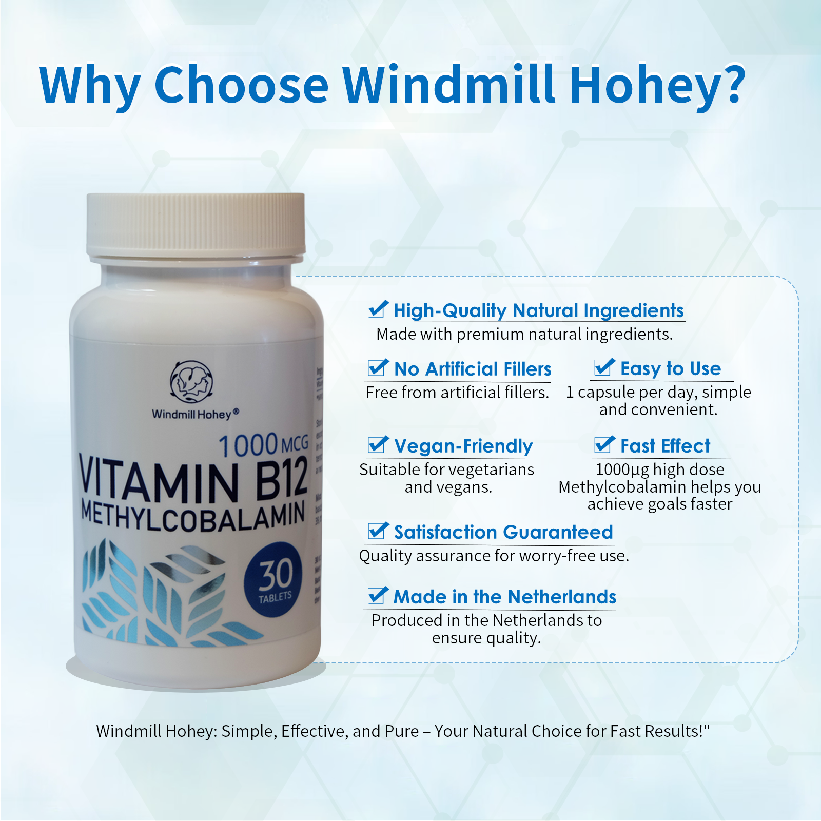 Unlock your body’s full potential with Ultra B12 1000mcg from Windmill Hohey—a trusted brand renowned for its commitment to quality and excellence. Each tablet delivers a potent 1000mcg dose of Methylcobalamin, the most bioavailable form of Vitamin B12, ensuring you get the maximum benefits with every serving.
